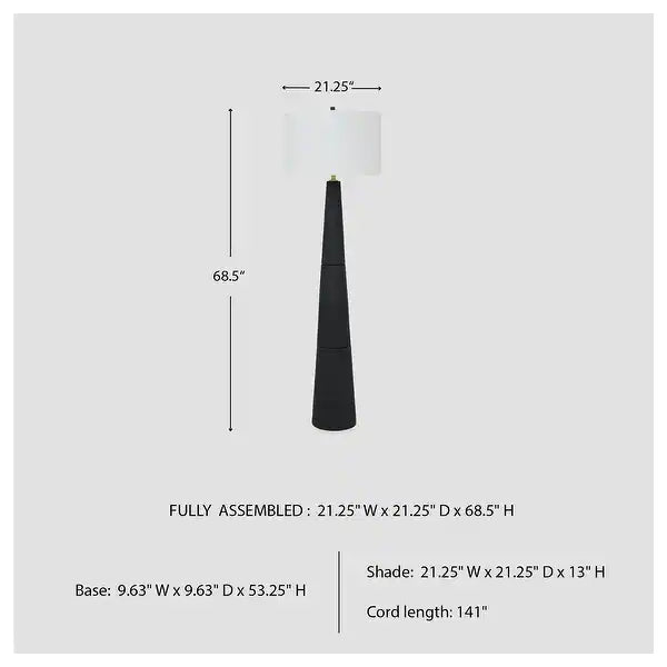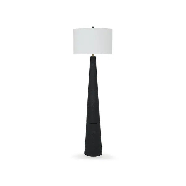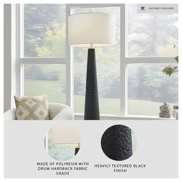 Lámpara negra con textura fabricada en poliresina y pantalla en tela blanca.